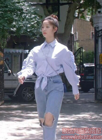 这还是徐好比较正常的一款衬衫,也是比较经典的一款,但是在她搭配起来,也是特别的时髦,上身是一件灯笼袖花边压折衬衫,下摆没有像普通人那样,也没有扎进裤子,而是打了个结,很随意,也很时尚,下身是一条破洞牛仔裤,真是年轻就是本钱,特别年轻又可爱。